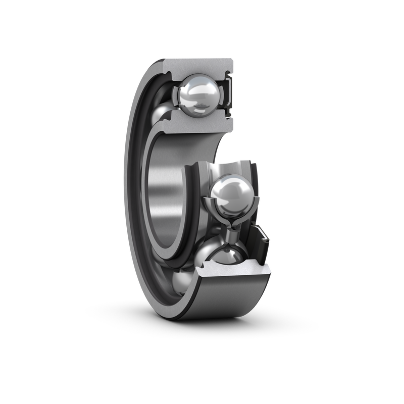 Single row deep groove ball bearings with seals on one or both sides are particularly versatile, have low friction and are optimized for low noise and low vibration, which enables high rotational speeds. They accommodate radial and axial loads in both directions, are easy to mount, and require less maintenance than other bearing types. The integral sealing can significantly prolong bearing service life because it keeps lubricant in the bearings and contaminants out.