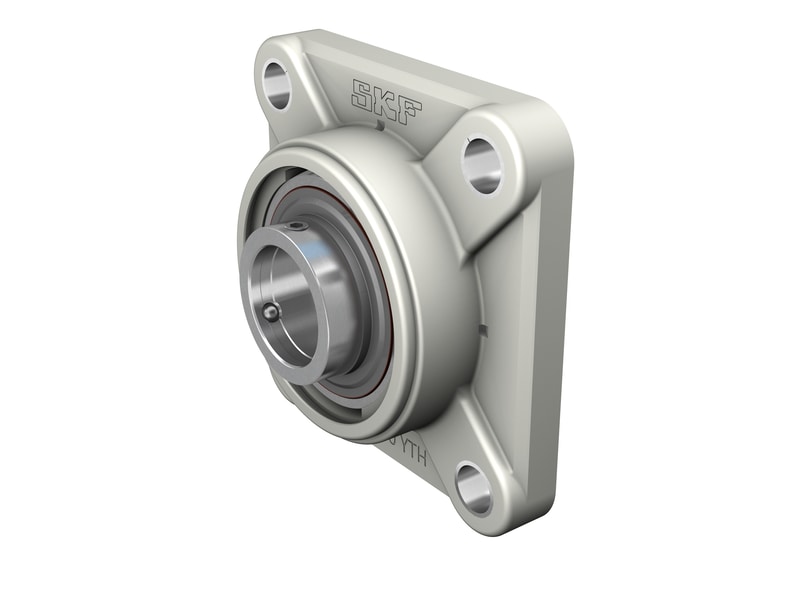 These square flanged ball bearing units are designed especially for the food and beverage industries. They are chemical resistant, lightweight and strong. The unit consists of an insert bearing, with an extended inner ring and set screw locking, and is suitable for applications where the direction of rotation is constant or alternating. The bearing is mounted in a housing, which can be bolted to a machine wall or frame.