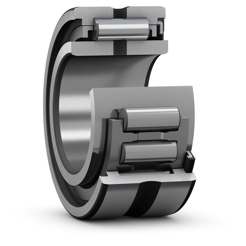 Single row needle roller bearings incorporate cylindrical rollers that are small in diameter relative to their length. Owing to their large number of rollers, the bearings have a high load carrying capacity. The outer ring includes two integral flanges to guide the bearing axially and an annular groove with one or more lubrication holes to facilitate relubrication. The inner ring contains an additional lubrication hole.